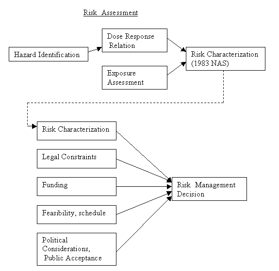 The early 1970's saw an enormous increase in health risk related laws and regulations. The Occupational Safety and Health Act and the creation of the Environmental Protection Agency for two. By the late 1970's congress realized that there were many federal agencies evaluating risk, and that they were often using very different standards. Congress commissioned the National Academy of Science (NAS) to study the issue and develop a strategy for evaluating risks. In 1983 the NAS produced Risk Assessment in the Federal Government: Managing the Process. The NAS proposed that the risk process be divided into two phases. The first phase, the Risk Assessment should be separated, completely if possible, from the second phase, Risk Management. The risk assessment would result in a statement of the probability and severity of the harm. Then the risk management phase would decide what, if anything, would be done about the risk. Risk assessment would be a scientific process, unsullied by money and politics. Risk management would start with this scientific input, then consider cost, benefits, politics, and many practical considerations. Here is diagram of the two phases.