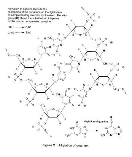 Uggg. Twenty years ago, when my engineering business was prospering in the field of hazardous materials and waste, I decided to try to understand the why of the hazard business. This led me to study industrial hygiene and finally toxicology. But starting out on that quest, I would find items like Figure two above and feel totally incapacitated. Sure I studied chemistry, long, long ago, but then they had only four elements: earth, fire, air, and water. What was "guanine," why would someone want to alkylate it, and what's all the other garbage about it? Anyhow, if you look at Figure 2 above and say, "Of course," you can skip this sub-module and the next ones on chemistry, organic chemistry, biochemistry too. If you said, "Uggg!" the purpose of these modules is to give some familiarity with the key terms and nomenclature such that you are not totally intimidated by things like Figure 2, as well as review some basic chemistry that impacts toxicology.