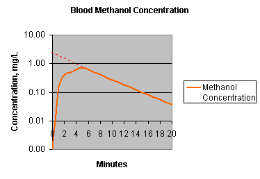 The solid orange line is the concentration of methanol as it moves away from the peritoneum and equilibrate throughout the body, about minute 6 this equilibration is complete and the decline after that is due to first order elimination of the chemical. The dashed line, extrapolates back to the concentration at time zero. The mass of methanol injected, divided by the extrapolated concentration at time zero (before any elimination takes place) yields the volume of distribution. |