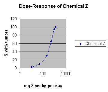 At the lowest dose tested, 10 mg / kg day, the study found 2% of the rats had tumors - 3 males and one female. If you are doing a risk assessment in anticipation of using chemical Z in toothpaste, what sort of risk would you be comfortable with? 1 tumor in 10,000 or 1 in 100,000? If we knew the dose of Z that produced tumors in one of 100,000 rats, we could work backwards and estimate how much Z can safely be put in toothpaste. How many rats would you need? How about 800,000, I'd guess. That would be 100,000 males and that many females in each of four groups. With some economy of scale, you might treat them for $500 each, then the testing would cost only $400,000,000.