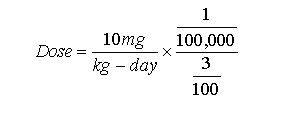 We just stretch a straight line from the lowest data point we have, 2% at 10 mg/kg-day, to 0% at 0 dose. (We converted from a log to a arithmetical axis.) From here it is easy to compute the dose that could cause a tumor in 1 out of 100,000 male rats. It would be :