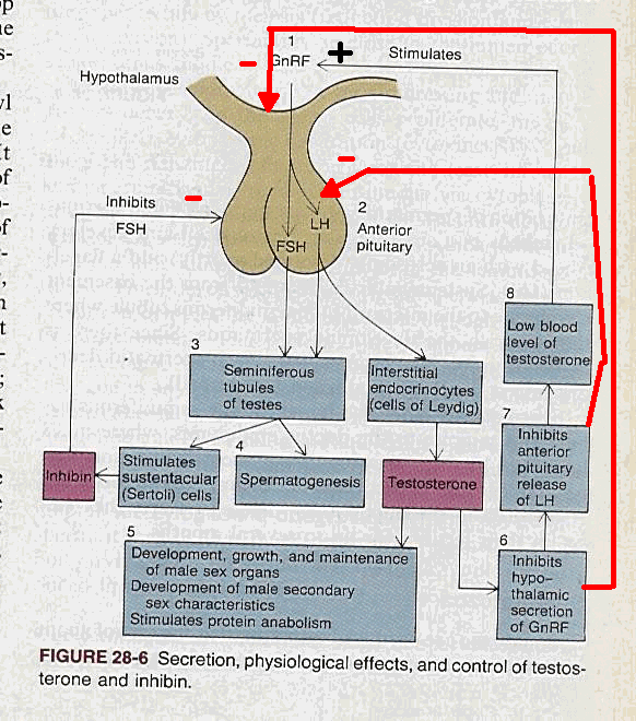 Lets start at the top. The hypothalamus is part of the CNS, i.e., nerve tissue. Hanging directly below the hypothalamus is the pituitary gland. The pituitary is the body's master gland, it controls the function of other glands. The pituitary has two parts, one part secretes hormones directly from a type of nerve tissue, and one part secretes other hormones from gland (epithelial ) tissue. FSH and LH are secreted by the glandular part of the pituitary. (FSH and LH are called gonadotropic hormones.) Above the number one indicates that the hypothalamus secretes a hormone GnRF (Gonadotropin Releasing Factor) into the blood supply of the pituitary. That stimulates the pituitary to release FSH and LH, shown as step 2. The FSH enters the blood and is circulated to the seminiferous tubules of the testes, step 3, where it stimulated spermatogenesis and the supporting cells, the Sertoli cells step 4. In a parallel track, LH stimulates the Leydig cells to secrete testosterone. Step 5 indicates the circulating testosterone stimulates muscle development, and male secondary sexual characteristics (including baldness). The circulating testosterone does several things. It directly inhibits the secretion of LH by the pituitary (step 7) and it also inhibits the secretion of GnRF from the hypothalamus (step 6). When these inhibitions lead to a decrease in the circulating testosterone, this stimulates the hypothalamus to increase the secretion of GnRF. A similar feedback process exists between the hormone inhibin and FSH.