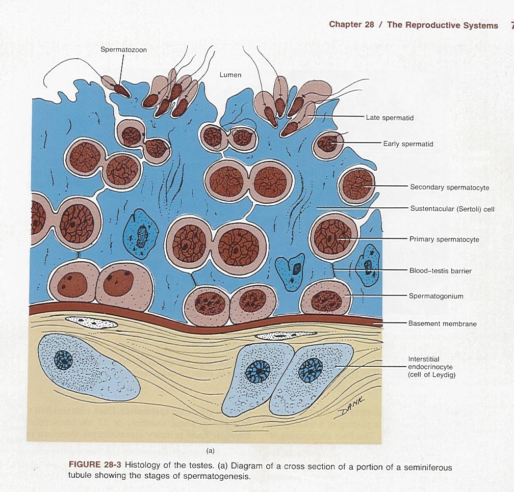 Here's a diagram of a cross section through a seminiferous tubule. The "lumen" is the channel of a tubular organ, i.e., water flows through the lumen of a pipe. Shown are stages in the maturation of spermatozoon from the germ tissue, the spermatogonium, a diploid cell (two sets of chromosomes) to the spermatozoa, a haploid cell (one set of chromosomes). The basement membrane is connective material secreted by epithelial cells and connective tissue cells. Above the basement membrane are cells that support the maturation process, called Sertoli cells (aka sustentacular cells). Below the basement membrane are the Lydig cells. The Lydig cells are endocrine cells that secrete testosterone. Between the Lydig cells are shown some connective tissue cells or myoid cells (smooth muscle tissue). Not shown well, because it is not distinct, is the blood-testis barrier. Blood is supplied to the region below the basement membrane by capillaries. In order for a chemical to transfer between blood and spermatozoon, the chemical must traverse the capillary lining (endothelium, the cells that make up the capillary), the connective tissue and myoid cells, the the basement membrane, the Sertoli cells, to reach the spermatozoa.