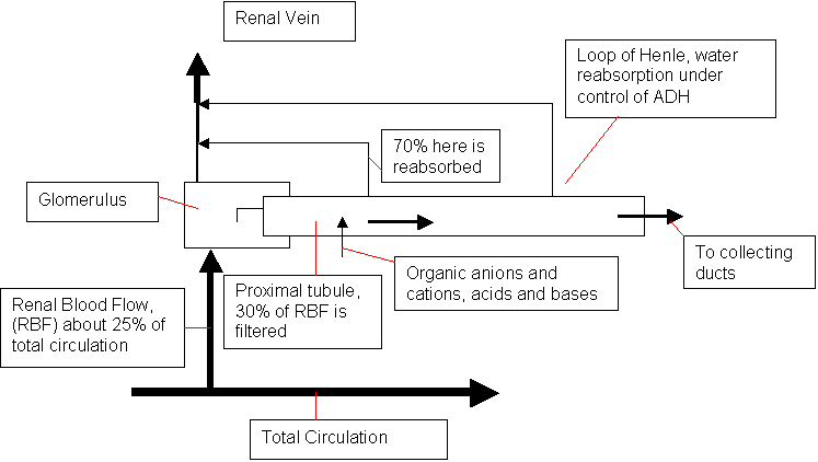 The kidneys receive an enormous blood flow, about 25% of cardiac output. From that renal blood flow, about 1/2.5 millionth arrives via small arteries at the glomerulus at the beginning of each nephron. There 20% to 40% of the blood is "filtered," meaning it leaves the blood vessel (capillary) and enters the nephron. The larger molecules remain in the blood, for example, only 0.005% of albumin-sized molecules will enter the nephron. Molecules with a molecular weight of less than 5000 Dalton will be 100% filtered. In the part of the nephron closest to the glomerulus, ingeniously called the proximal tubule, sodium is actively pumped back into the blood and water follows, so the 70% of the salts and water go back to the blood in the proximal tubules. Near the start of the nephron, also in the proximal tubule, are cells that pump organic anions, cations, acids and bases from the blood directly into the tubule. The beginning and end of the nephron is in the outer layer of the kidney, called the cortex. The middle portion, called the loop of Henle descends into the middle of the kidney, called the medulla. The kidney get saltier towards medulla, so the loop of Henle travels through a very salty environment, but even here, as the loop descends into the medulla, it pumps salt out of the tubular fluid. Finally as the loop rises out of the medulla back to the cortex, the loop of Henle gets thick and impermeable to water. Water would flow out of the loop by osmotic pressure, since the medulla is much saltier than the tubular fluid. This impermeable region of the loop, however, has cells that can permit water to flow, they are controlled by a hormone, ADH (anti diuretic hormone), which is secreted by nerves from the hypothalamus that terminate in the pituitary. So the final adjustment of water balance happens in the loop of Henle and is controlled by ADH. The nephron then terminates in large vessels that handle more fluid. At this point the tubular fluid is called urine.