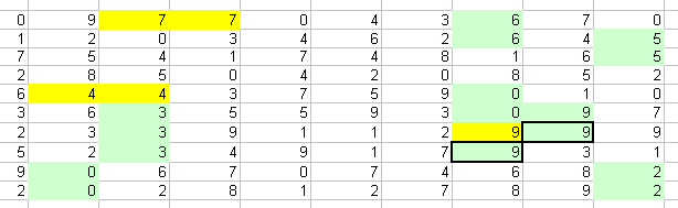 Where adjacent cells in a row have the same number, the cells are highlighted in yellow. Where cells in a column are the same they are in green, and where they are both a row and column, they are boxed. Since each cell has 4 neighbors and there are 10 random numbers that can go in those cells, we would not be amazed to find that 4/10 or 40% of the cells have an identical neighbor. Here my knowledge of statistics and probability are inadequate, but look at the 3's in the third column and the 9's in columns 8 and 9. The four 9's especially "look too close together." Now drop back and look at the three center columns that have no matches, as does first column. The matches seem concentrated in only half of the 10 columns: 2,3,8,9 and 10. Why are columns 5,6, and 7 devoid of matches? My answer is simply that truly random distributions are not smooth, they are lumpy.