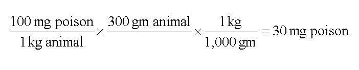 Dose per Body Weight Tests are done on batches of animals of the same strain and species and similar age and weight. But, animals within a batch often differ in body weight. When toxicologists poison lab animals, we frequently express the dose as mg/kg. That means milligrams of the poison per kilogram of animals' body weight.