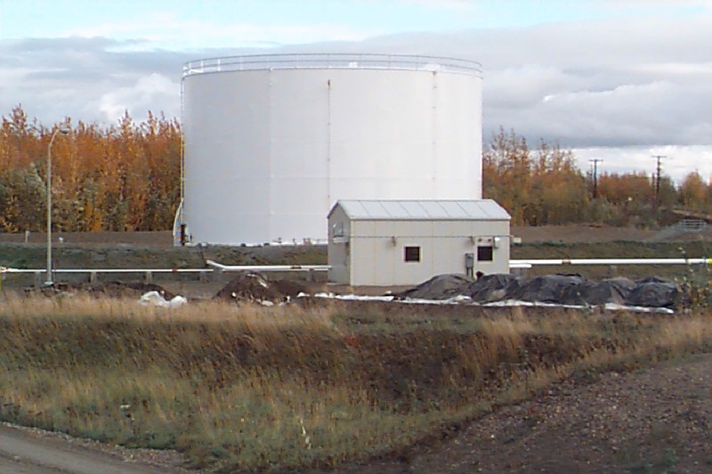A nice new aboveground tank. The dike is between the tank and the building, which is a pump house. Note the pipe must get from the pumphouse to the tank, either through the dike or over it. The spiral stairs run toward the rear, out of sight, the straight pipe on the left side of the tank is an electric conduit or pipe for firefighting foam.