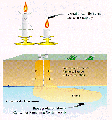 Again, the candle analogy is useful to illustrate how active and natural remediation can be combined. If the top half of the candle (the source) is cut off and removed, the flame (plume) will exist for only a fraction of the original time. Bioventing, soil vapor extraction, and free product removal are all methods of reducing the source of contamination. The rate at which the candle bums can be enhanced by increasing the supply of oxygen. The addition of oxygen to the groundwater plume using biosparging or oxygen release compounds will enhance the natural rates of biodegradation and speed up the plume's destruction.