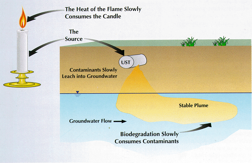 "Intrinsic" and "passive" remediation are other terms that have been used to describe the combined effect of these processes. Dr. John Wilson of the EPA compares natural attenuation in groundwater to a lighted candle. The source of the flame is the wax of the candle, just as the source of the groundwater contamination is the more concentrated petroleum trapped in the soil. The flame appears steady because the wax is destroyed in the flame as fast as it is removed from the candle. In the same way, the groundwater plume will reach "steady state" at some distance from the source when natural bacteria are able to destroy contaminants as they enter the groundwater from the soil. Eventually, the candle is consumed by the flame just as contaminants in the soil and groundwater are consumed by natural bacteria.