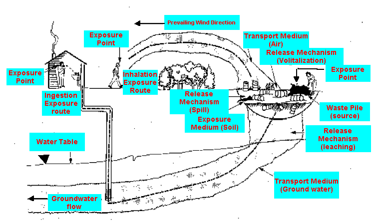 3. There are three "mediums" that are contaminated, but since the contaminant is moving in or through two of the mediums, we think of these as transport media, rather than "sources." Soil might be a transport media, if it is blown by wind or moved by water runoff.