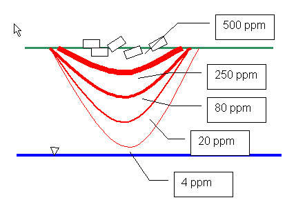 The drawing indicates the average concentration of MEK in a region. The concentration of MEK is not constant under the dump, but varies spatially. Are those concentrations the same today? That's unlikely. The MEK may be migrating towards the groundwater, it may be migrating into the air, it may be metabolized by soil micro-organisms, and it may be changing chemically into something other than MEK. It is probably doing all this and more.