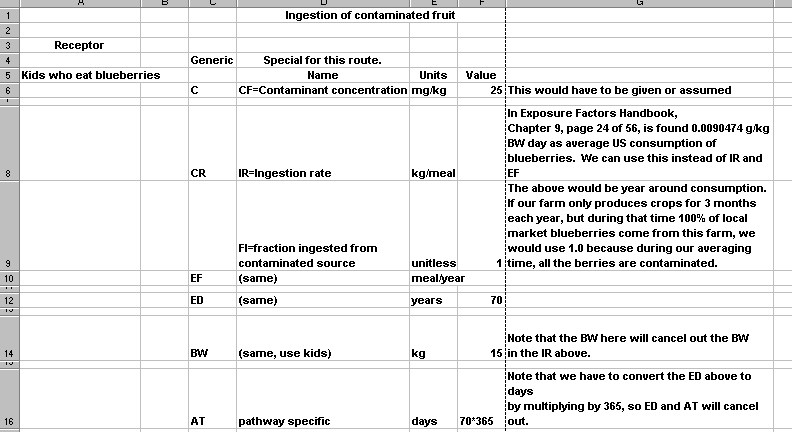 Here is a picture of my spread sheet. Note I had to plug in a value for the amount of contamination in the blueberries. On a real site we might analyze the berries directly or analyze the soil and use computations to estimate what the berries might be. Here I used 25 mg / kg, that would be 25 mg of PCP per kg of berries.