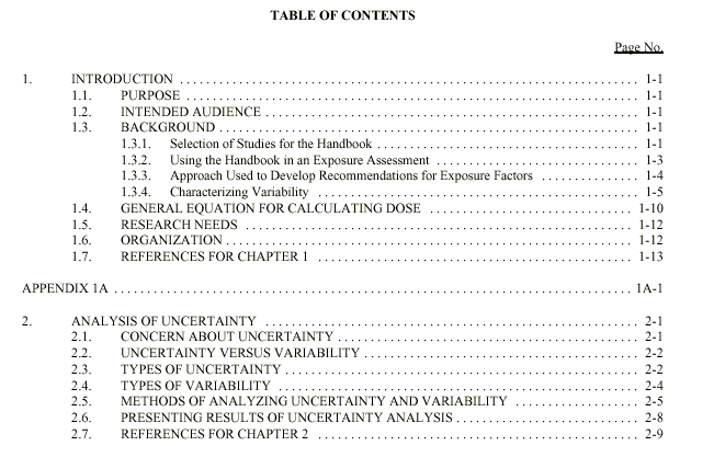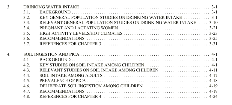 This page and the next two have the Table of Contents of the Exposure Factors Handbook and hyperlinks to the book chapters. Although this book is labeled a "Draft," it is where I would go to determine any of the information. For now, just cruise through the TOC items on the next few pages and get an idea what is available from the handbook.