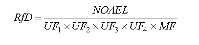 The rational for evaluating the non-carcinogenic effects is the assumption that they have a threshold. That is, a dose below which there are no adverse health effects. That threshold is referred to as the reference dose (RfD). The RfD is the amount of xenobiotic per kg of body weight per day that is not expected to result in adverse health effects. Here is how the RfD for humans is calculated: Take the NOAEL (or LOAEL) from animal studies and divide by some uncertainty factor. (You remembered that NOEL stood for no observed effects level. NOAEL means about the same thing and stands for no observed adverse health effects. LOAEL is similar and is the lowest dose when harmful effects were noted.) Here is a scientific-looking equation: