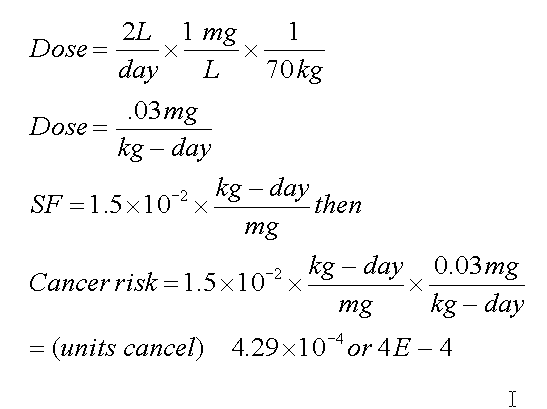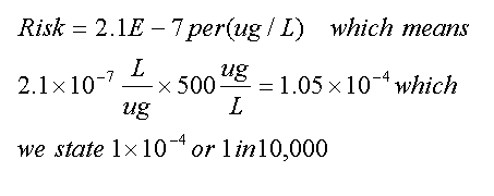 The concentration in water is 500 ug/L, which is 5E+2 ug/L and thus E-4 or 1 in 10,000 as given a few lines above. Or you could get it from the Drinking water unit risk a few more lines above: