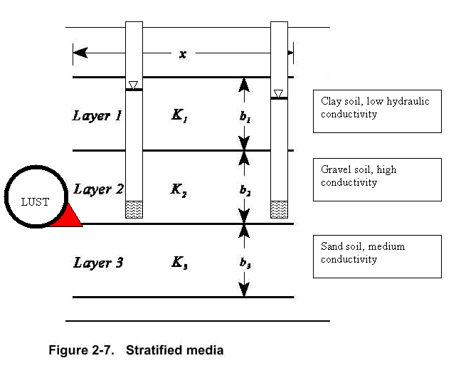 Skim 2-13a and b and 2-14, but here is a summary that is important. Soils are not homogeneous, they are very heterogeneous. If you dig a hole and examine the layers, the hydraulic conductivity is rarely the same in different layers of soil. Now digging a trench for some distance in one direction, we see that the layers are neither uniform nor continuous. The word "isotropic" means that the property of interest is the same in all directions. The word "anisotropic" means the property is not the same in all directions. Look at figure 2-7 and here: Suppose that Layer 1 is a clay soil that has a very low hydraulic conductivity, Layer 2 is a gravel with a high hydraulic conductivity, and Layer 3 is a sand with an intermediate conductivity.