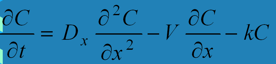 Which, roughly translated, means that the change in concentration of contaminant C with time in the X direction is equal to the dispersivity Dx in the X direction times the the change in concentration gradient of C with respect to X minus the velocity times the change in concentration with respect to x. The first term accounts for the dispersivity of the medium and second for the velocity of the water.