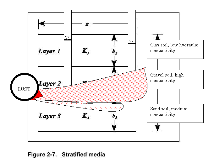 Contaminant movement in groundwater is controlled advection and dispersion and often degradation, as well. The complex equations in sections 2-16 and 2-17 only deal with advection. Here's what they look like in one dimension with dispersion thrown in: