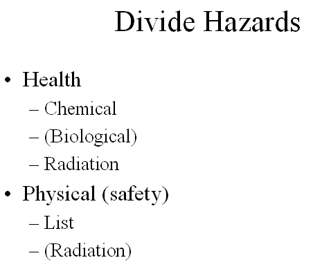 We have not talked much about biological hazards, bacteria and viruses. Bears are usually included in Safety hazards. Radiation is considered a health hazard.