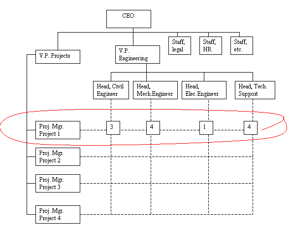 The project manager of Project 1 went to the Head Civil Engineer and had 3 civils assigned to his project, then to the Head Mechanical to get 4 MEs, the Head Electrical to get 1 EE, and finally the Head of the Technical Support to get 4 technicians, all assigned to Project 1. (I call these "discipline heads"or chiefs.) When the electrical portion of Project 1 is complete, the Project Manager of Project 1 will send the EEs back to Head Electrical for reassignment. If the project managers need advice or temporary help, they can likewise go to the discipline head of the right technical department and request that assistance. The other projects are similar (I didn't bother to fill in examples of the staffing levels). A variation on this theme for industrial firms might be that instead of discipline heads, those are existing functional departments that are expected to supply people and or expertise to the project as needed. Meredith distinguishes a strong matrix as above, where the worker bees are assigned to the project manager, who becomes their day-to-day supervisor, from a weak matrix, where the project manager might be the only full-time worker on the project, the other project members are assigned only temporarily and their day-to-day supervision remains with their functional or discipline head.