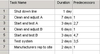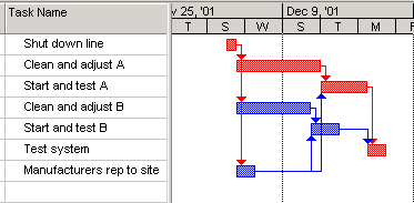 When the plant has its annual turnaround it must: shut the line down, do maintenance on both machines, test each machine, then restart the line. For each machine there are two tasks, Clean and adjust, and start and test. One more activity, the manufacture of the the machines requires a representative on site before the machines are restarted.
