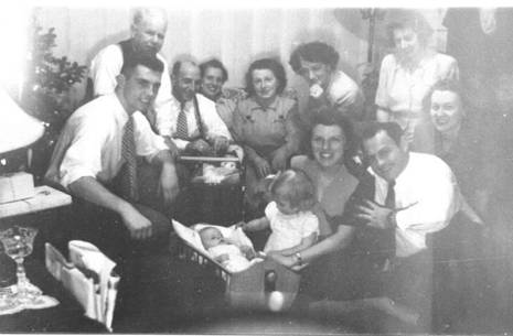 Christmas 1945, 1st row, John LaCava Jr., Robert Allan Perkins in cradle, Robin Rimmler, Elizabeth Rimmler Perkins, Charles M. Perkins. Marjorie Meadows Rimmler. 2d row, Ernst Ruff, John La Cava Sr., Susanna Rimmler, Elise Rimmler Ruff, Helena Rimmler LaCava, Lusie Rimmler Hagner |