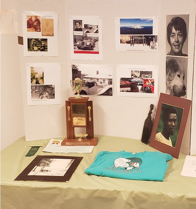 Click on the photo below, which will take you to see individual photos. Then click on each of those photos to advance to the next photo. Below, the trophy is from a sports car rally. Photo is art work of Diane's driver in Nigeria, object to left is a native comb. Sweatshirt is Alaska Peace Corps reunion memento. Ribbon is from a Pittock family reunion in England.