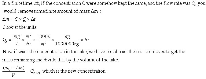 The reason is that the MEK concentration of water you are removing for those 10 hours is not 100 mg/ L. At every instant, you are removing some mass MEK from the lake and the concentration left in the lake is constantly decreasing. That is, you are removing a constantly smaller amount of contaminant with each succeeding time increment.