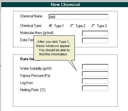 For the chemical properties, you will have to use your resources. I gave you a site for finding Kow. When you are ready for the Level 1 model, start by clicking New Chemical