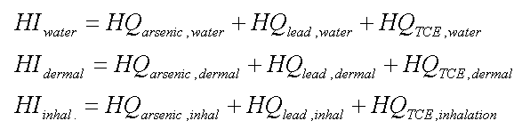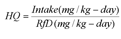 The first step in characterization of non-cancer risks is to evaluate, for each receptor, the dose for each chemical via each route. Say we have a site with toxic metals and TCE. First we compute a hazard quotient ( HQ ) by dividing each intake by the RfD.