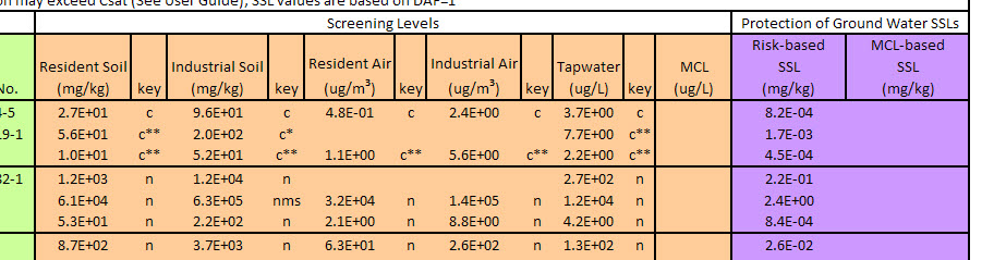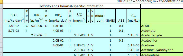 So what do the column heading mean? Go to Users Guide and then at the bottom, Table 1 will have all the definitions of the abbreviations and their default values. The top of that Users Guide there are some useful definitions that by now you should be familiar with, but would not hurt to review. The "key" refers to the top row of the RSL table that tells what is the source of that tox number. "VOC" refers to the designation as Volatile Organic Contaminate, which puts it in a different class for some analyses.