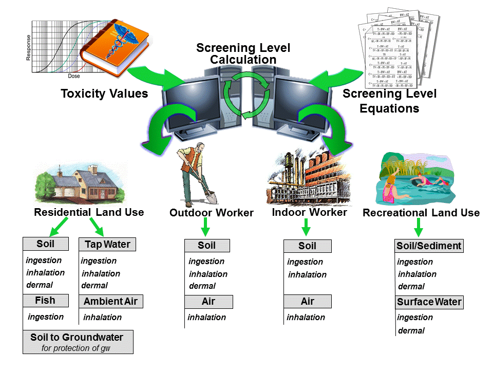 The notion of a risk-based concentration starts with the global assumption that there is a level of contamination at which the risk of adverse effects is so low that there is no need to proceed with a detailed (and expensive) risk assessment. These are called risk-based concentrations or risk-based screening levels. In 1986 or thereabouts, I got an 81/2 by 11 sheet from the New Jersey Environmental Agency that has RBC's for 20 or so of the most common soil contaminants. (New Jersey is my home state, but I avoid going there; I was given that sheet at a conference in Washington D.C.) For each chemical it had the chemical's name and a concentration. End of story. About that time the EPA Region 3, which if you look on a map is the tier of states just below New Jersey and almost as polluted, started to develop a similar RBC table. Unlike the New Jersey table, which I believe was developed by real estate brokers who wanted to sell land, the EPA table was developed by a toxicologist. It started out simple and un-bureaucratic, it made sense and was easy to read. The RBC has been under assault ever since. Today it starts with a 10 page disclaimer and is no longer "simple." It is still valuable, however. It is not meant to cover air pollution and leaching to groundwater but that is for bureaucratic reasons rather than science.