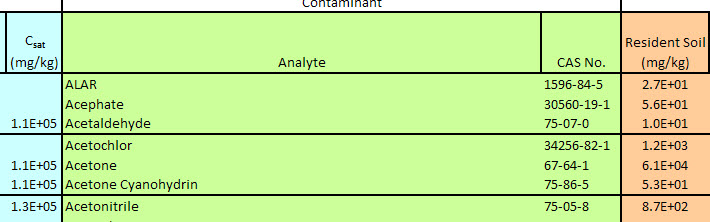 Now the RBC/RSLs. What this says is that for Acetochlor (the fourth line down) if you had an industrial site with 1.2 x 104 mg of acetochlor per kg of soil (1.2 g / kg), the risk is very small. Further that the risk is from non-cancer effects.
