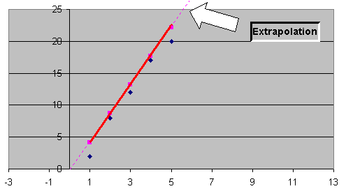 We might use an extrapolation of the data to estimate the student's attitude on Saturday night. The extrapolation would indicate the attitude would be around 25, the best attitude all week. Of course the student might be studying that weekend and have a poor attitude on Saturday night. Or we might extend the extrapolation to day 8, the Monday of the following week and estimate that the students attitude would be far better than last Monday.