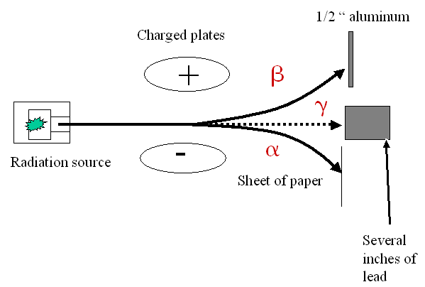 When a radioactive source is aimed at a photographic film and focused through charged plate, the film was exposed in three locations, corresponding to three types of charged particle. Also, the amount of material that was required to stop those particles varied. The three types are known as alpha, gamma, and beta radiation.