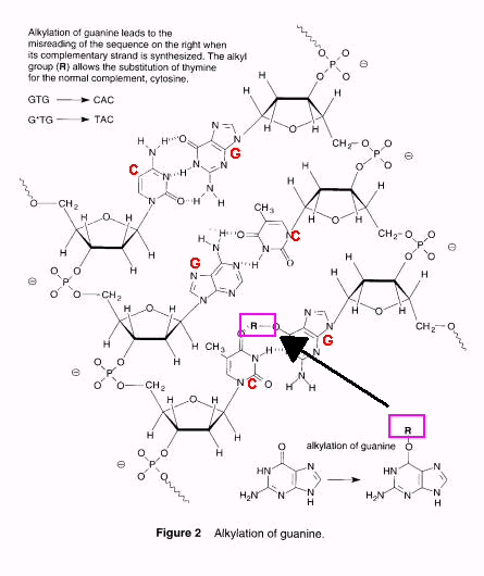 What is shown here is a flat representation of DNA. The phosphate groups are outboard, the sugars next, and the interior shows the nitrogenous bases, cytosine(C), and guanine(G) (there are two other bases in DNA, adenine (A)and thymine(T)). The bases are heterocycles with nitrogen and oxygen atoms, both of which have some electrons to give away. If a chemical that would like some electrons (an "electrophile") were to make its way to the base, a chemical reaction could take place. The pictures on the lower right seems to show the guanine as floating in space, but in fact it is attached to the sugar. The "R" could be any organic, hydrocarbon-type molecule. Once attached to the DNA, we refer to the R as an "adduct." The upper pictures show the R attached to the guanine, in the middle of the DNA molecule. What happens next?