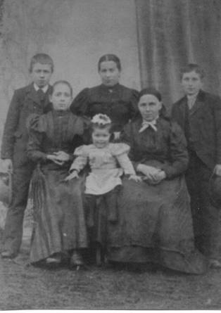 Wagerers. Sitting Gram (Susanna), sitting in white, Rosl, Anna nee Sigl. Standing, Josep (son of Anna Wagerer) Anna Wagerer, Alfons Wagerer. If this was taken in 1900, Gram would be 14 and Alfons would be 17, Anna nee Sigl would be 58, Anna would be 32. |
