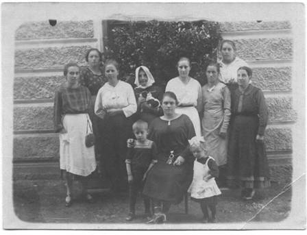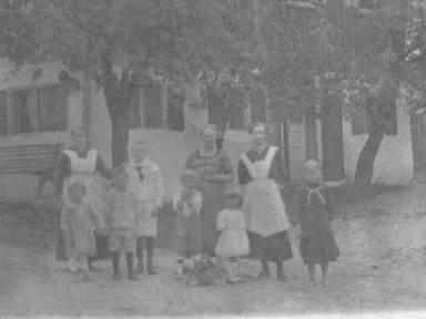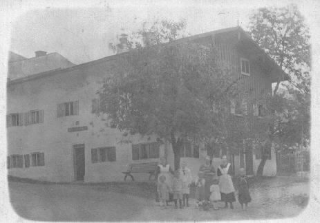 Wagerer homestead in Egglham. Adults standing left to right: Anna Wagerer, Maria Auemiller, Susanna (Sani) Rimmer nee Wagerer (Gram). Kids, l to r, Marl (Maria), Sepp (Joseph), Alfons, Fritzel (Fred Rimmler) Elizabeth Rimmler (Mom) and Bernhard. This would have been taken during a trip Gram took to Germany in 1921.