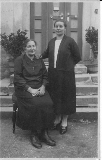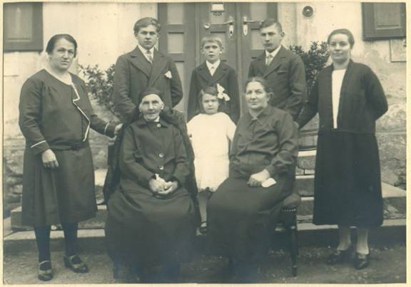 Back row, three sons of Alfons Wagerer senior: Bernard, Hans, Josef. (Alfons junior was already in US.) Standing on left, Elisabeth Wagerer, widow of Alfons Wagerer. Sitting, Anna Sigl Wagerer (Grandmother of Fred Rimmer and Elizabeth Perkins {ERP}, great-grandmother of author), Paula Wagerer in white (daughter of Alfons and Elisabeth, sister of Alfons junior), Anna Wagerer (aunt of ERP, sister of Suzanna Rimmler nee Wagerer). Standing on right, Rosl Wagerer (daughter of Anna). |